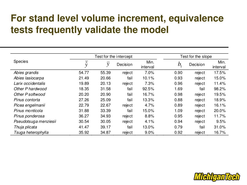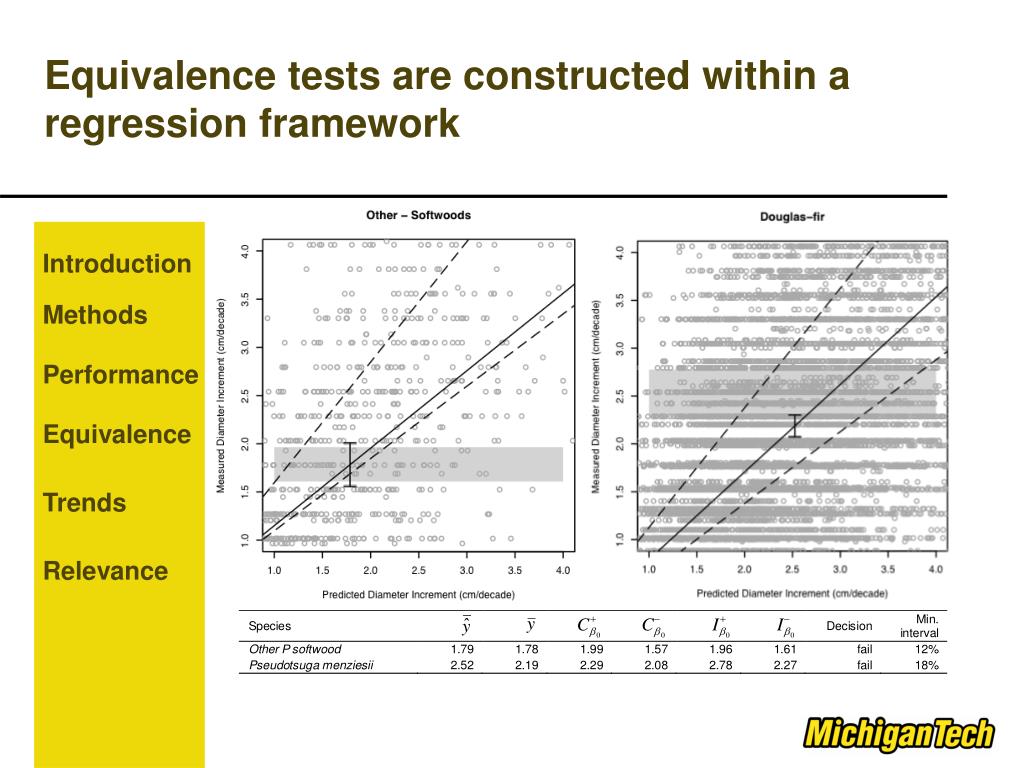Wykoff’s model for prediction • Equivalence tests provide an objective methodology for assessing model validity • There is added subjectivity in the selection of I • For diameter, a large I would be necessary to validate Wykoff’s model • For most species I = 25% would have to be used • largely because of bias not two-one-sided CI • For volume, the model is largely validated • But trends show bias is close to zero for average conditions • Overprediction of > 3 mil m3•dec-1 is not insubstantial • Species results differ, and may imply invalid stand dynamics Introduction Methods Performance Equivalence Trends Relevance