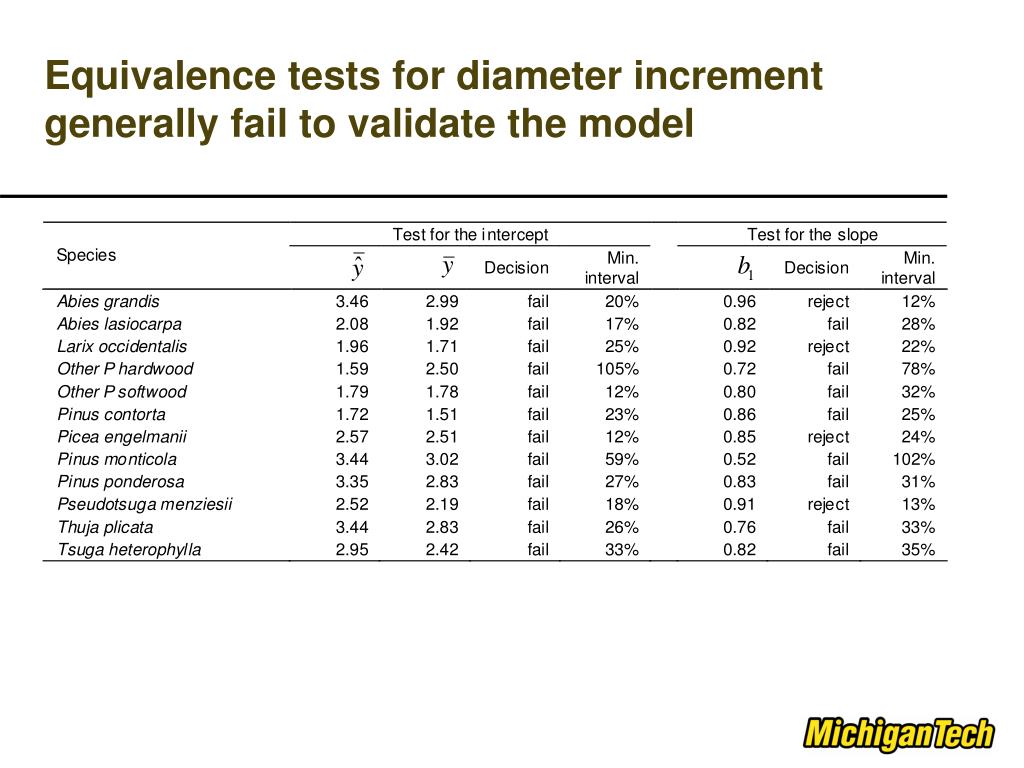 Summary Wykoff’s model modestly over predicts diameter increment, but the effect on volume is smaller ∆D 14% ∆V 2% Equivalence tests fail to validate the model for diameter increment, but less often for volume As a theory, the model is surprisingly robust The way climate is represented in the model needs to be addressed
