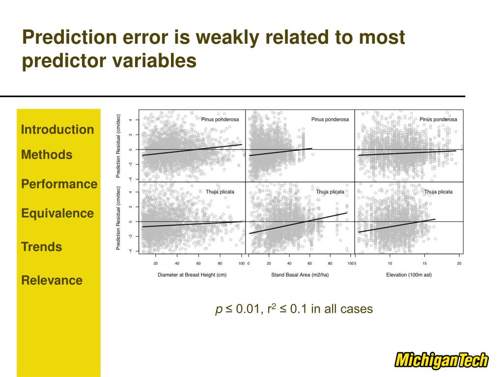Prediction error is weakly related to most predictor variables Introduction Methods Performance Equivalence Trends Relevance p ≤ 0.01, r2 ≤ 0.1 in all cases