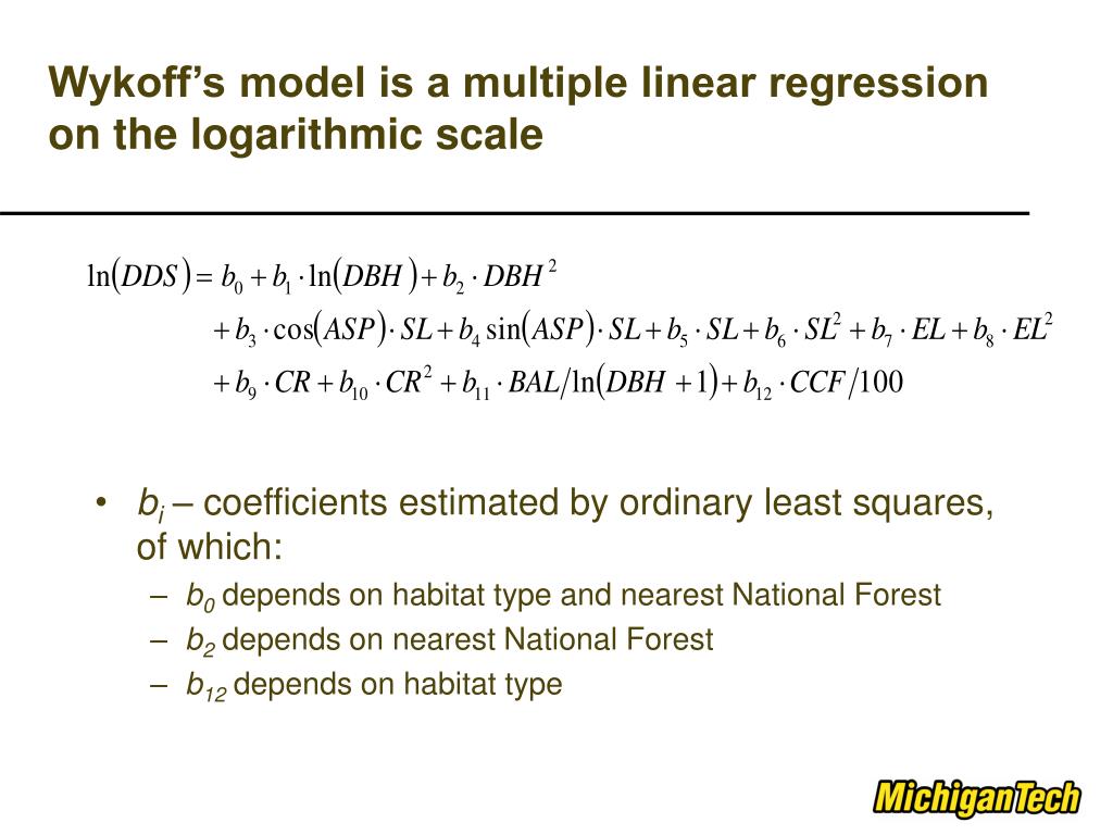 Wykoff’s model is a multiple linear regression on the logarithmic scale • bi – coefficients estimated by ordinary least squares, of which: • b0 depends on habitat type and nearest National Forest • b2 depends on nearest National Forest • b12 depends on habitat type
