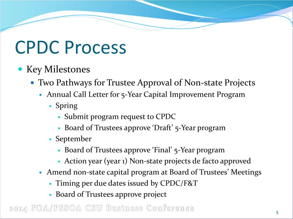 CPDC Process • Key Milestones • Two Pathways for Trustee Approval of Non-state Projects • Annual Call Letter for 5-Year Capital Improvement Program • Spring • Submit program request to CPDC • Board of Trustees approve ‘Draft’ 5-Year program • September • Board of Trustees approve ‘Final’ 5-Year program • Action year (year 1) Non-state projects de facto approved • Amend non-state capital program at Board of Trustees’ Meetings • Timing per due dates issued by CPDC/F&T • Board of Trustees approve project