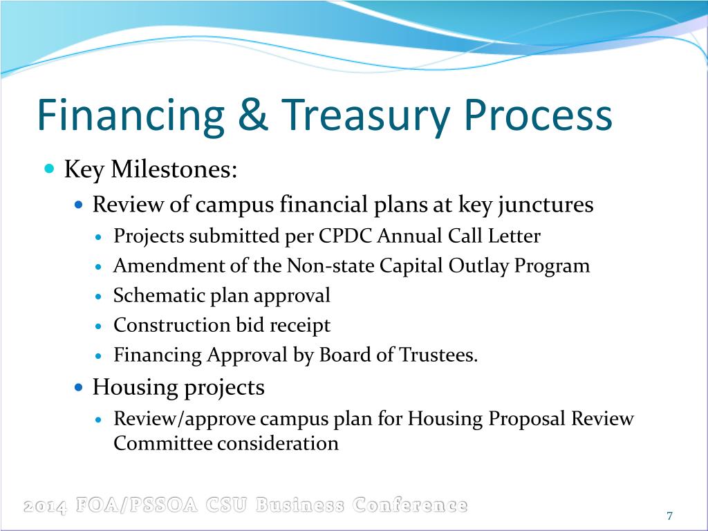 Financing & Treasury Process • Key Milestones: • Review of campus financial plans at key junctures • Projects submitted per CPDC Annual Call Letter • Amendment of the Non-state Capital Outlay Program • Schematic plan approval • Construction bid receipt • Financing Approval by Board of Trustees. • Housing projects • Review/approve campus plan for Housing Proposal Review Committee consideration