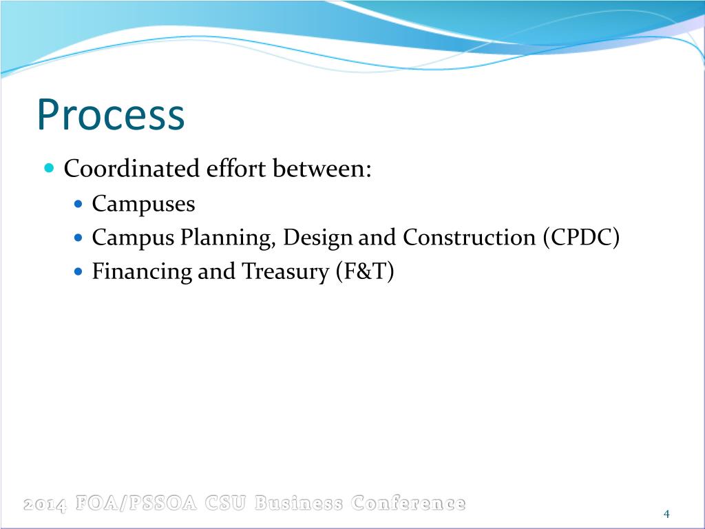Process • Coordinated effort between: • Campuses • Campus Planning, Design and Construction (CPDC) • Financing and Treasury (F&T)