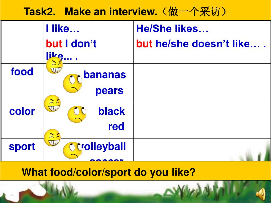 Task2. Make an interview.(做一个采访) What food/color/sport do you like?
