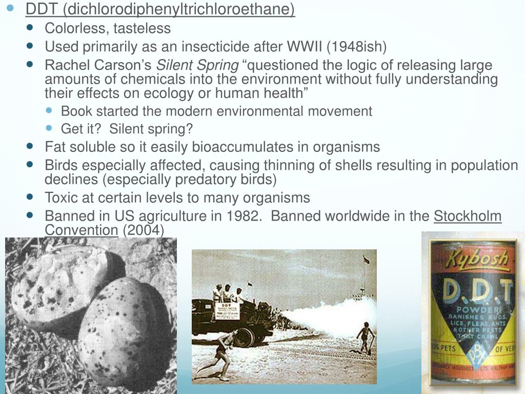 DDT (dichlorodiphenyltrichloroethane) • Colorless, tasteless • Used primarily as an insecticide after WWII (1948ish) • Rachel Carson’s Silent Spring “questioned the logic of releasing large amounts of chemicals into the environment without fully understanding their effects on ecology or human health” • Book started the modern environmental movement • Get it? Silent spring? • Fat soluble so it easily bioaccumulates in organisms • Birds especially affected, causing thinning of shells resulting in population declines (especially predatory birds) • Toxic at certain levels to many organisms • Banned in US agriculture in 1982. Banned worldwide in the Stockholm Convention (2004)