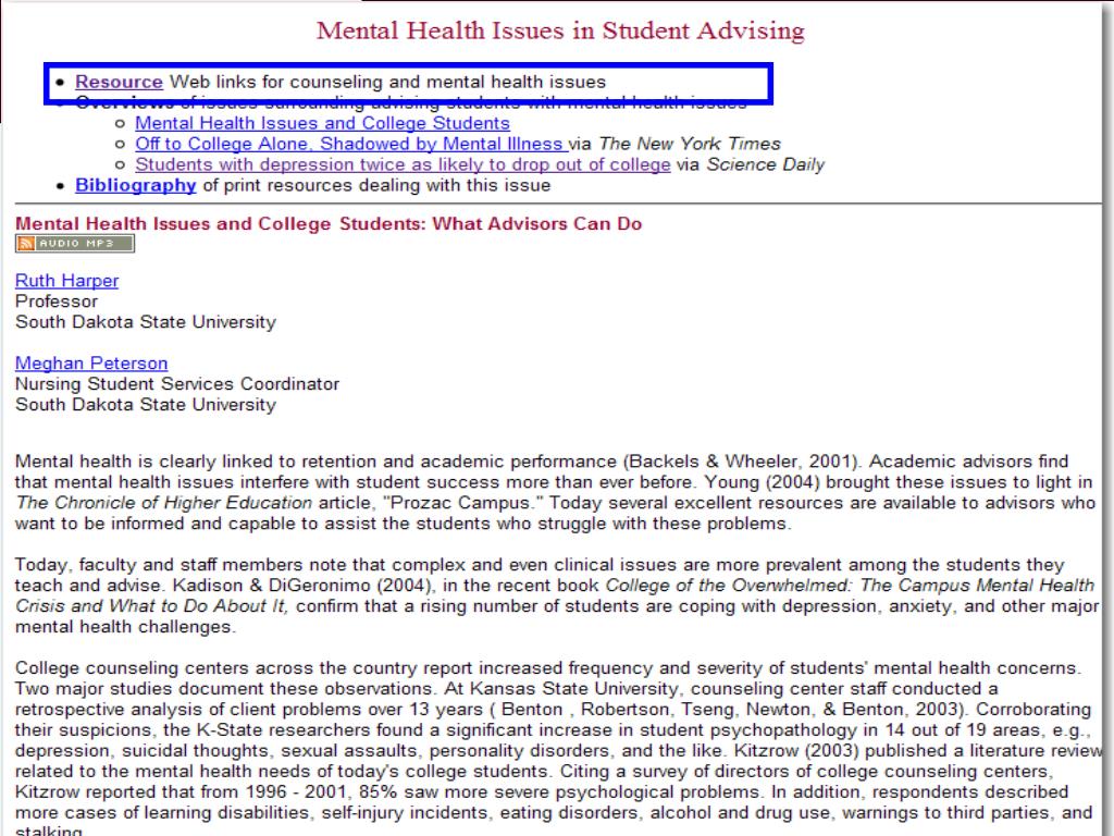 NACADA Resources Needs and Characteristics of Students and their Parents • Mental Health Issues • Proactive parents • Exploring students