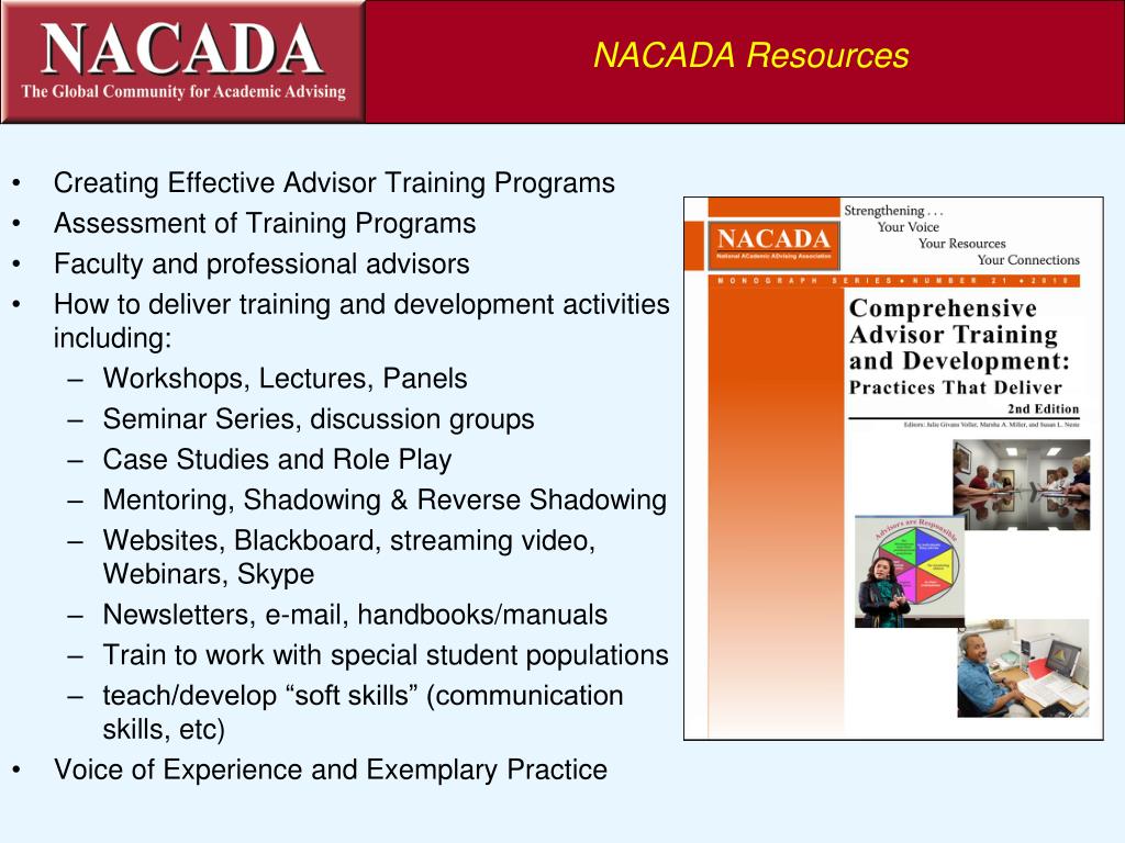 NACADA Resources • Creating Effective Advisor Training Programs • Assessment of Training Programs • Faculty and professional advisors • How to deliver training and development activities including: • Workshops, Lectures, Panels • Seminar Series, discussion groups • Case Studies and Role Play • Mentoring, Shadowing & Reverse Shadowing • Websites, Blackboard, streaming video, Webinars, Skype • Newsletters, e-mail, handbooks/manuals • Train to work with special student populations • teach/develop “soft skills” (communication skills, etc) • Voice of Experience and Exemplary Practice