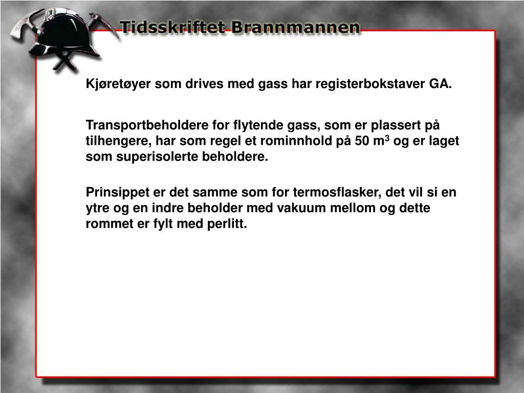 Kjøretøyer som drives med gass har registerbokstaver GA. Transportbeholdere for flytende gass, som er plassert på tilhengere, har som regel et rominnhold på 50 m3 og er laget som superisolerte beholdere. Prinsippet er det samme som for termosflasker, det vil si en ytre og en indre beholder med vakuum mellom og dette rommet er fylt med perlitt.
