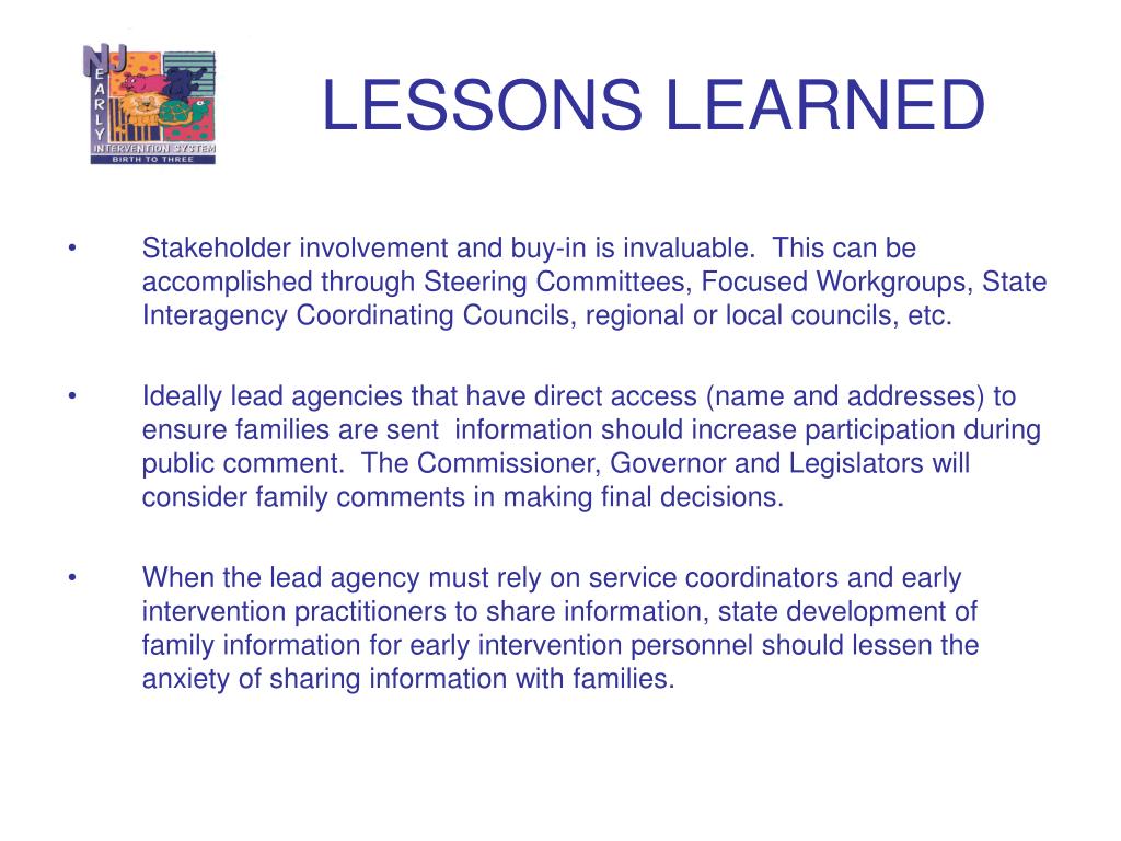 LESSONS LEARNED • Stakeholder involvement and buy-in is invaluable. This can be accomplished through Steering Committees, Focused Workgroups, State Interagency Coordinating Councils, regional or local councils, etc. • Ideally lead agencies that have direct access (name and addresses) to ensure families are sent information should increase participation during public comment. The Commissioner, Governor and Legislators will consider family comments in making final decisions. • When the lead agency must rely on service coordinators and early intervention practitioners to share information, state development of family information for early intervention personnel should lessen the anxiety of sharing information with families.