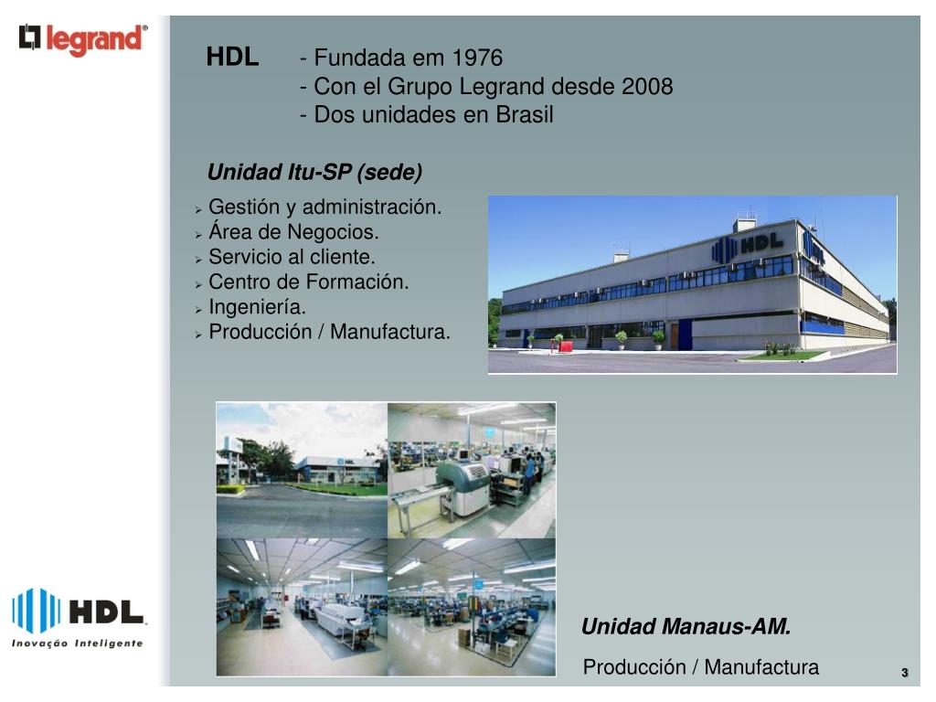HDL - Fundada em 1976 - Con el Grupo Legrand desde 2008 - Dos unidades en Brasil Unidad Itu-SP (sede) • Gestióny administración. • Área de Negocios. • Servicio al cliente. • Centro de Formación. • Ingeniería. • Producción / Manufactura. Unidad Manaus-AM. Producción / Manufactura