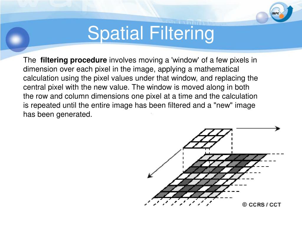 Spatial Filtering The filtering procedure involves moving a 'window' of a few pixels in dimension over each pixel in the image, applying a mathematical calculation using the pixel values under that window, and replacing the central pixel with the new value. The window is moved along in both the row and column dimensions one pixel at a time and the calculation is repeated until the entire image has been filtered and a "new" image has been generated.