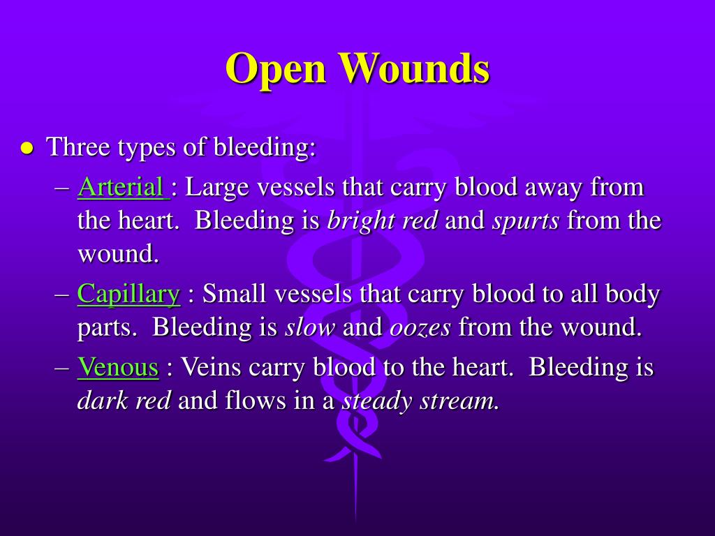 Open Wounds • Three types of bleeding: • Arterial: Large vessels that carry blood away from the heart. Bleeding is bright red and spurts from the wound. • Capillary : Small vessels that carry blood to all body parts. Bleeding is slow and oozes from the wound. • Venous : Veins carry blood to the heart. Bleeding is dark red and flows in a steady stream.