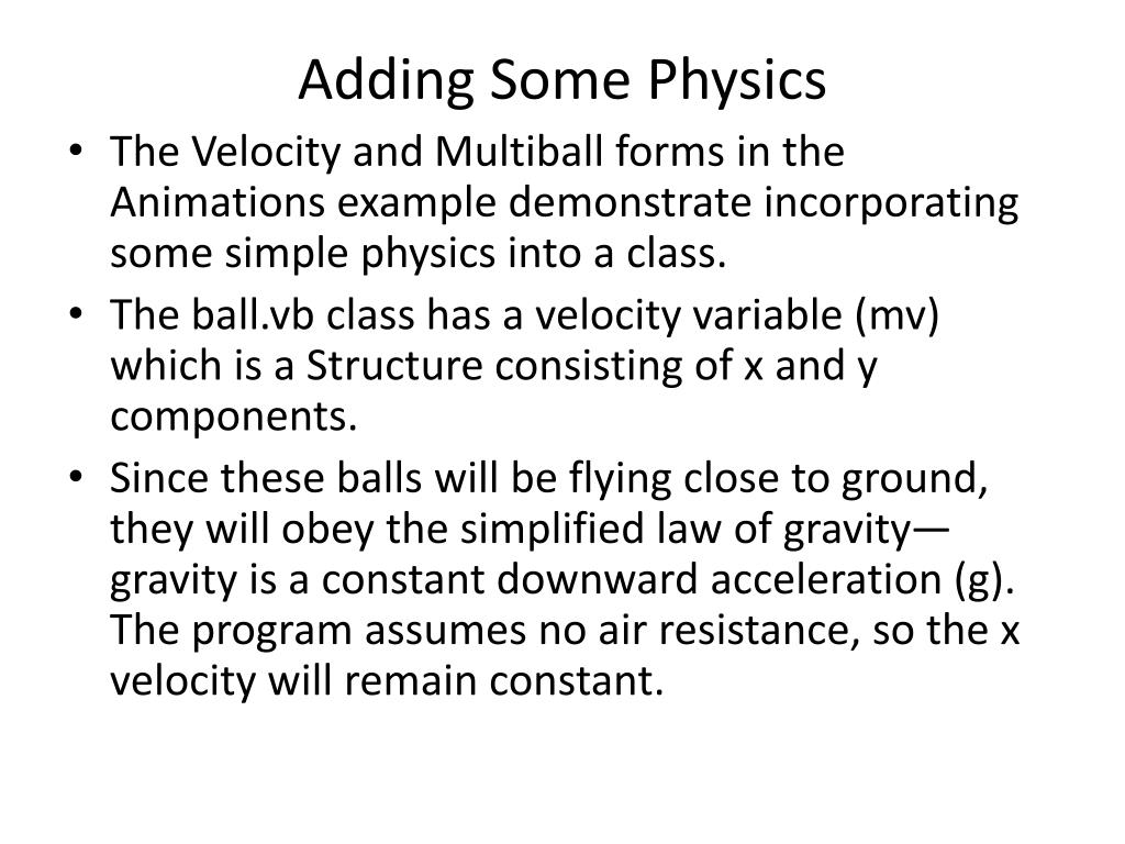Adding Some Physics • The Velocity and Multiball forms in the Animations example demonstrate incorporating some simple physics into a class. • The ball.vb class has a velocity variable (mv) which is a Structure consisting of x and y components. • Since these balls will be flying close to ground, they will obey the simplified law of gravity—gravity is a constant downward acceleration (g). The program assumes no air resistance, so the x velocity will remain constant.