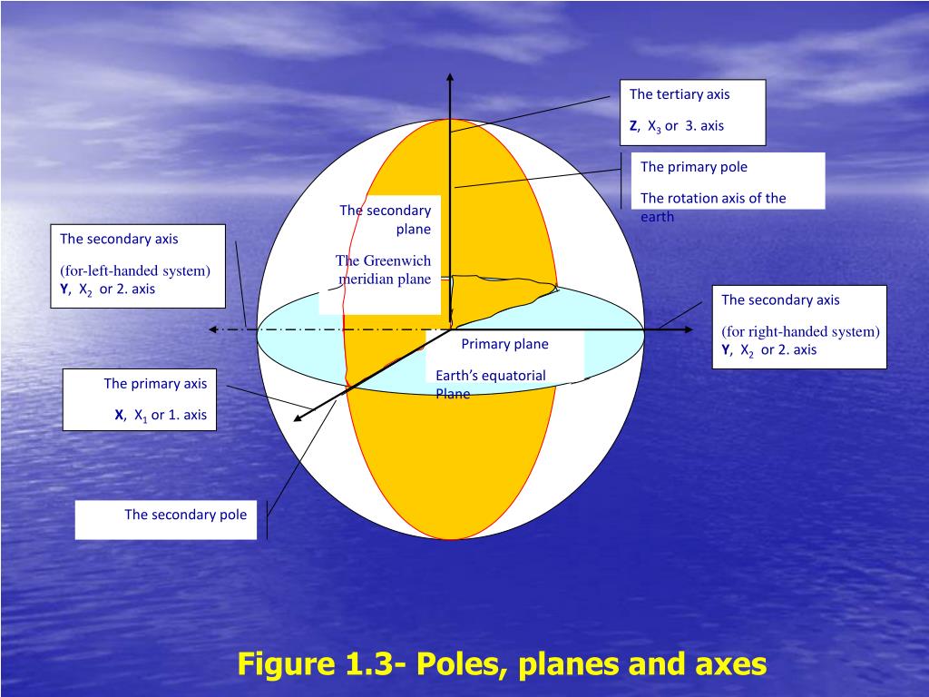 The tertiary axis Z, X3 or 3. axis The primary pole The rotation axis of the earth The secondary plane The Greenwich meridian plane The secondary axis (for-left-handed system) Y, X2 or 2. axis The secondary axis (for right-handed system) Y, X2 or 2. axis Primary plane Earth’s equatorial Plane The primary axis X, X1 or 1. axis The secondary pole Figure 1.3- Poles, planes and axes