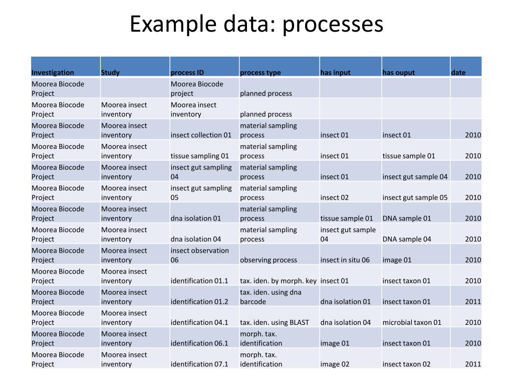 Museum specimens Initial focus of BCO: tracking materials and data through sampling chains Genbank sequence Tissue sample at Smithsonian Institution Digital image stored on Morphbank MooreaBiocode bioinventoryevent identification Metagenomic sequences at CAMERA portal Gut sample