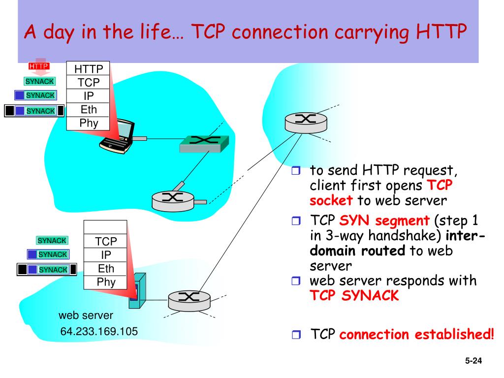 SYN SYN SYN SYN SYN SYN SYN HTTP TCP IP Eth Phy TCP IP Eth Phy HTTP SYNACK SYNACK SYNACK SYNACK SYNACK SYNACK SYNACK A day in the life… TCP connection carrying HTTP • to send HTTP request, client first opens TCP socket to web server • TCP SYN segment (step 1 in 3-way handshake) inter-domain routed to web server • web server responds with TCP SYNACK web server 64.233.169.105 • TCP connection established!