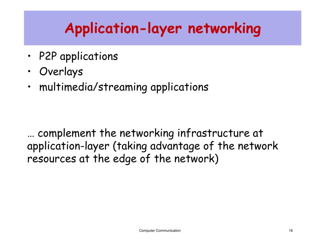 Application-layernetworking • P2P applications • Overlays • multimedia/streaming applications … complement the networkinginfrastructure at application-layer (takingadvantageof the networkresources at the edgeof the network) Computer Communication