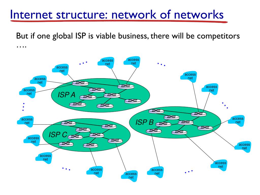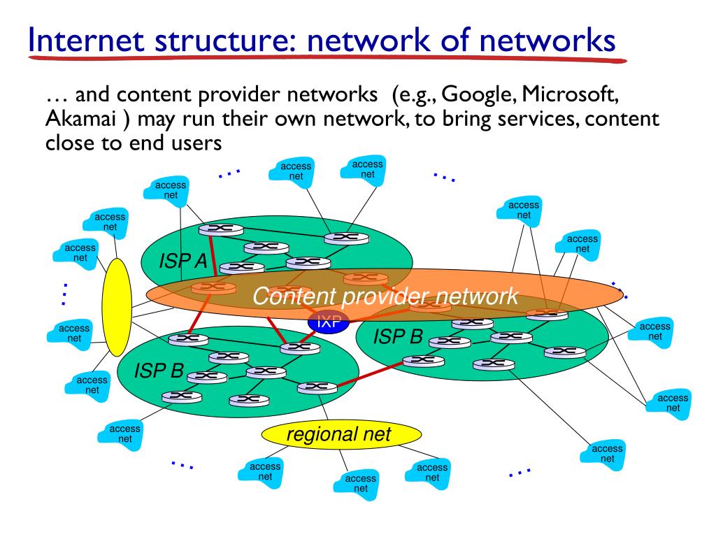 Internet structure: network of networks … and content provider networks (e.g., Google, Microsoft, Akamai ) may run their own network, to bring services, content close to end users … … ISP B ISP B ISP A IXP … … Content provider network access net access net access net access net access net access net access net access net access net access net access net access net access net access net access net access net regional net … …