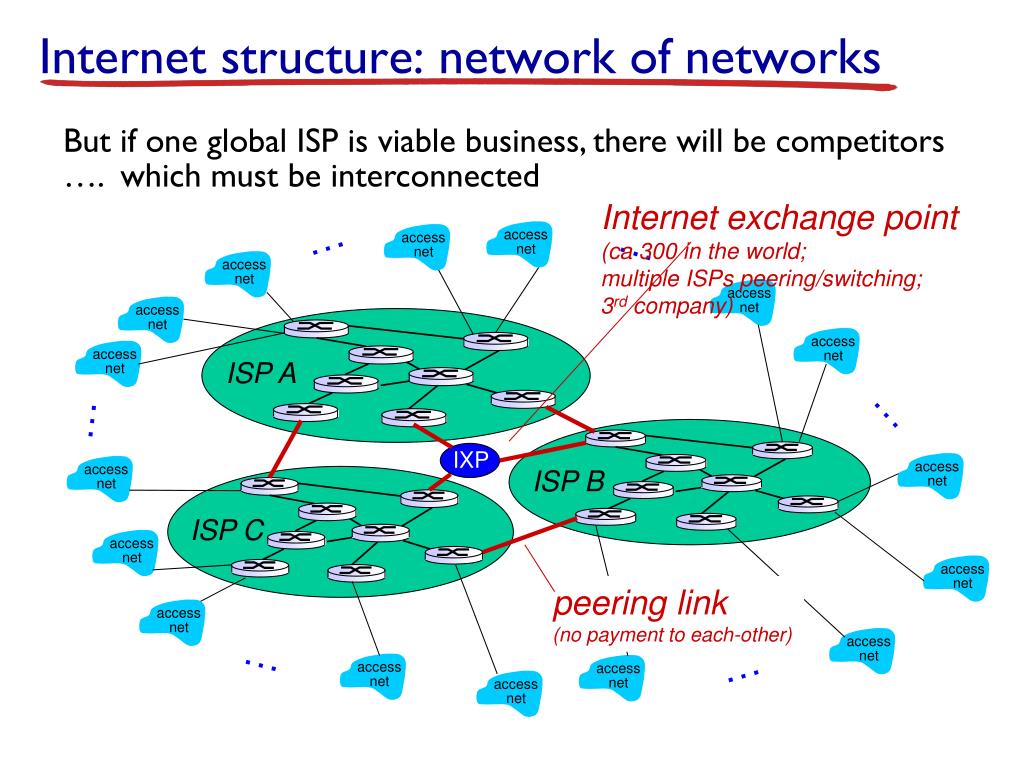 Internet structure: network of networks But if one global ISP is viable business, there will be competitors …. which must be interconnected Internet exchange point (ca 300 in the world; multiple ISPs peering/switching; 3rd company) … … ISP B ISP C ISP A IXP … … access net access net access net access net access net access net access net access net access net access net access net access net access net access net access net access net peering link (no payment to each-other) … …