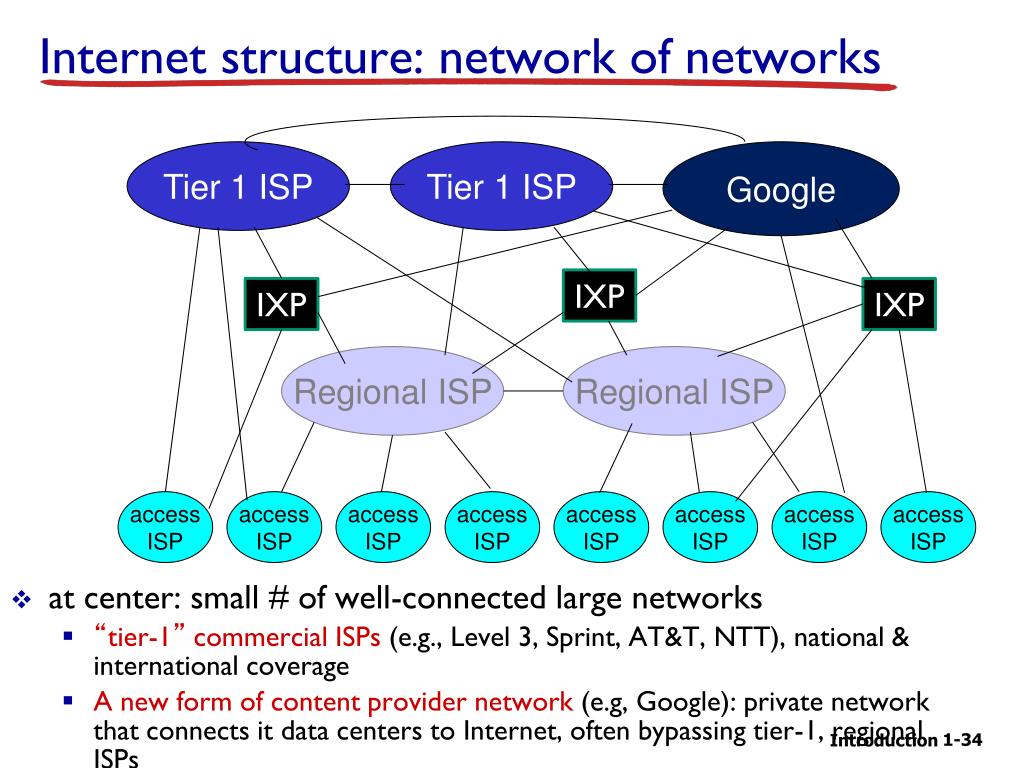 Internet structure: network of networks at center: small # of well-connected large networks “tier-1” commercial ISPs(e.g., Level 3, Sprint, AT&T, NTT), national & international coverage A new form of content provider network (e.g, Google): private network that connects it data centers to Internet, often bypassing tier-1, regional ISPs Tier 1 ISP Tier 1 ISP Google IXP IXP IXP Regional ISP Regional ISP access ISP access ISP access ISP access ISP access ISP access ISP access ISP access ISP Introduction