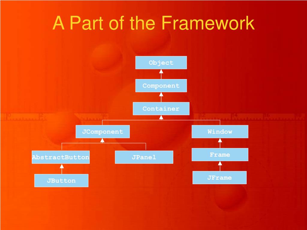 A Part of the Framework Object Component Container JComponent Window Frame AbstractButton JPanel JFrame JButton