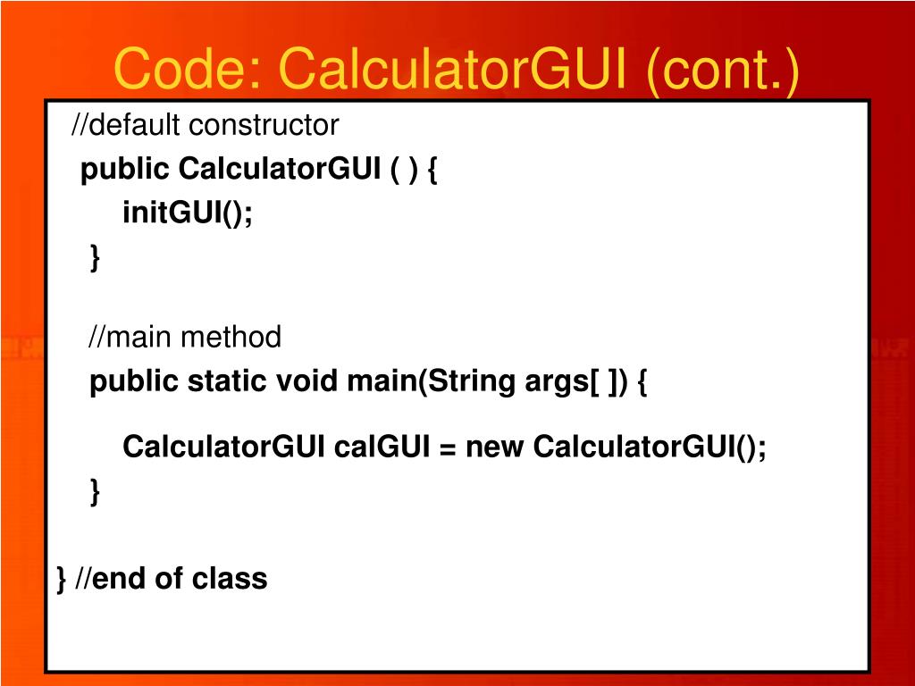 Code: CalculatorGUI (cont.) //default constructor public CalculatorGUI ( ) { initGUI(); } //main method public static void main(String args[ ]) { CalculatorGUI calGUI = new CalculatorGUI(); } } //end of class