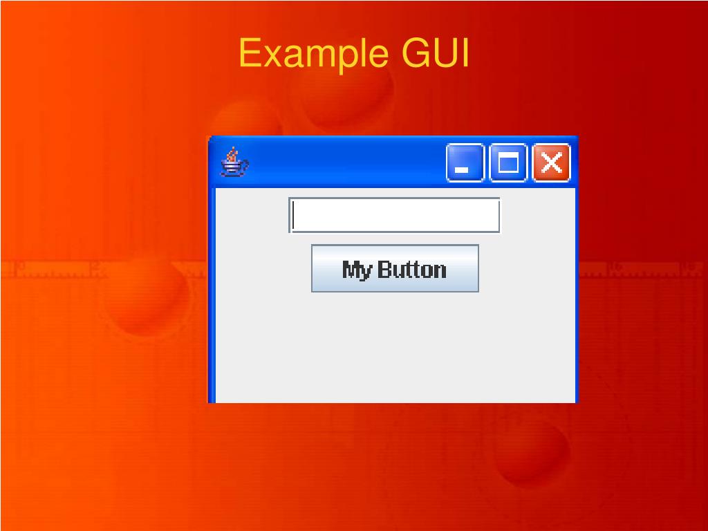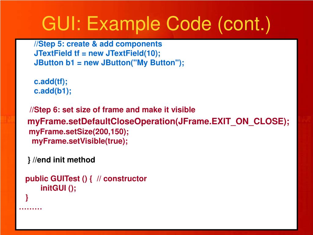 GUI: Example Code (cont.) //Step 5: create & add components JTextField tf = new JTextField(10); JButton b1 = new JButton("My Button"); c.add(tf); c.add(b1); //Step 6: set size of frame and make it visible myFrame.setDefaultCloseOperation(JFrame.EXIT_ON_CLOSE); myFrame.setSize(200,150); myFrame.setVisible(true); } //end init method public GUITest () { // constructor initGUI (); } ………
