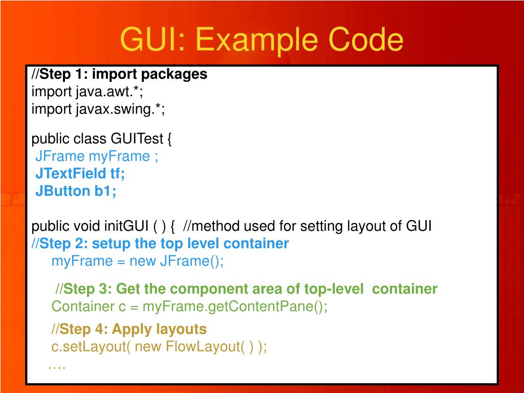 GUI: Example Code //Step 1: import packages import java.awt.*; import javax.swing.*; public class GUITest { JFrame myFrame ; JTextField tf; JButton b1; public void initGUI ( ) { //method used for setting layout of GUI //Step 2: setup the top level container myFrame = new JFrame(); //Step 3: Get the component area of top-level container Container c = myFrame.getContentPane(); //Step 4: Apply layouts c.setLayout( new FlowLayout( ) ); ….