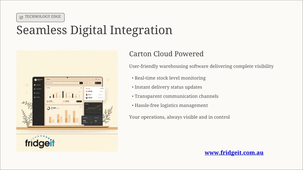 TECHNOLOGY EDGE Seamless Digital Integration Carton Cloud Powered User-friendly warehousing software delivering complete visibility • Real-time stock level monitoring • Instant delivery status updates • Transparent communication channels • Hassle-free logistics management Your operations, always visible and in control www.fridgeit.com.au