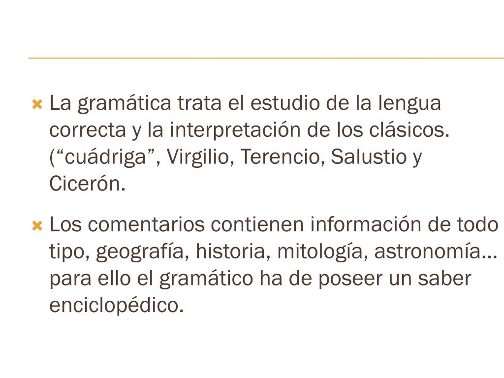La gramática trata el estudio de la lengua correcta y la interpretación de los clásicos. (“cuádriga”, Virgilio, Terencio, Salustio y Cicerón. • Los comentarios contienen información de todo tipo, geografía, historia, mitología, astronomía… para ello el gramático ha de poseer un saber enciclopédico.