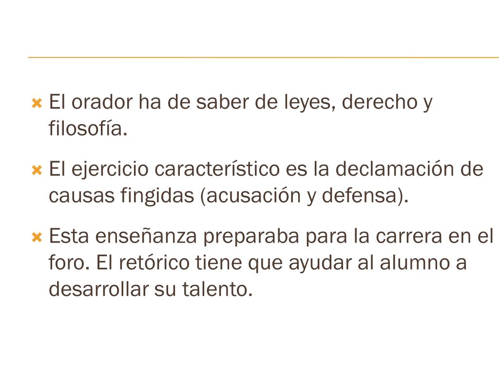El orador ha de saber de leyes, derecho y filosofía. • El ejercicio característico es la declamación de causas fingidas (acusación y defensa). • Esta enseñanza preparaba para la carrera en el foro. El retórico tiene que ayudar al alumno a desarrollar su talento.