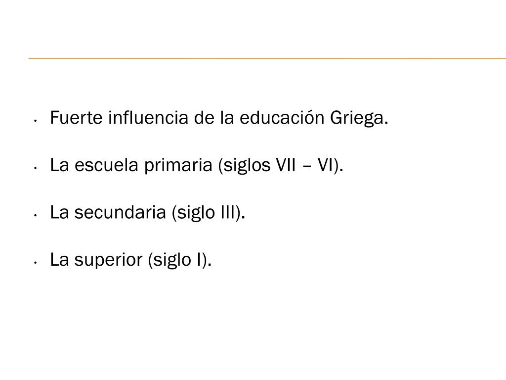 Fuerte influencia de la educación Griega. • La escuela primaria (siglos VII – VI). • La secundaria (siglo III). • La superior (siglo I).
