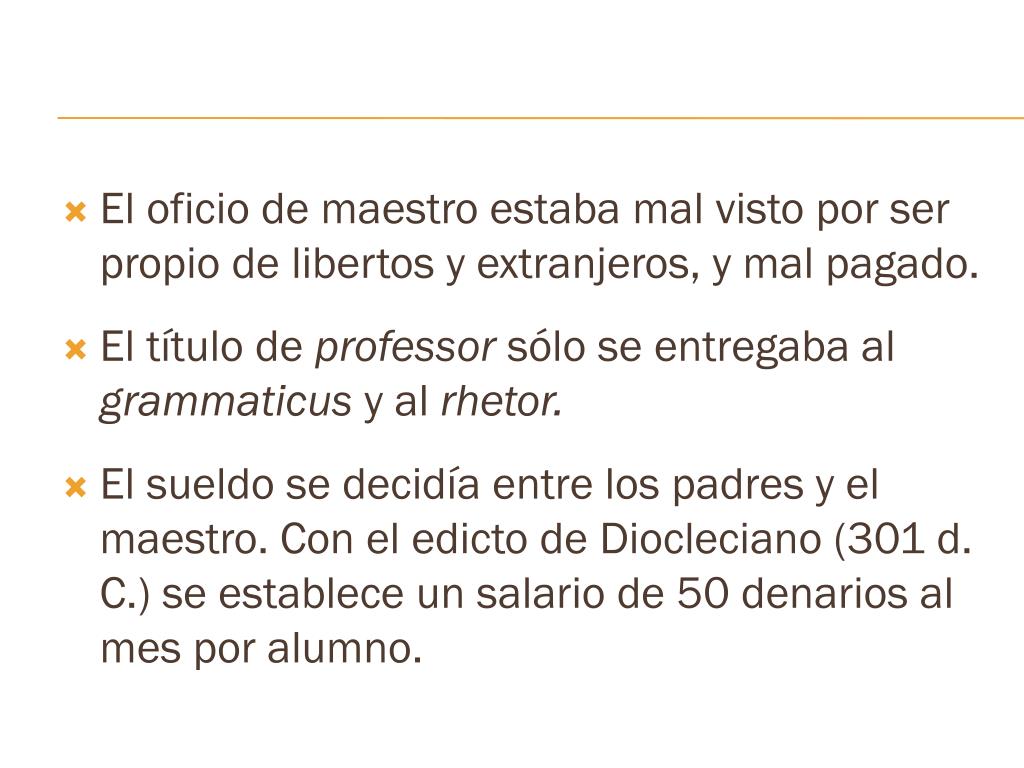 El oficio de maestro estaba mal visto por ser propio de libertos y extranjeros, y mal pagado. • El título de professor sólo se entregaba al grammaticus y al rhetor. • El sueldo se decidía entre los padres y el maestro. Con el edicto de Diocleciano (301 d. C.) se establece un salario de 50 denarios al mes por alumno.