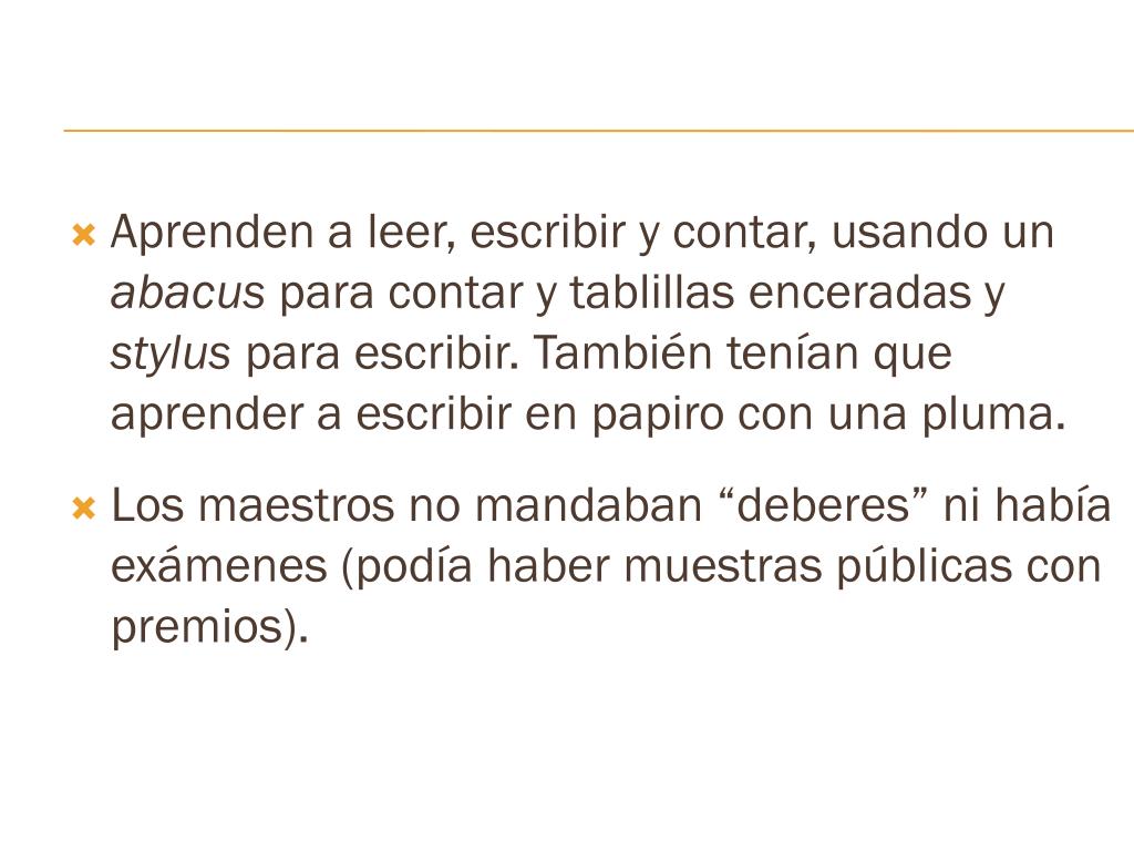 Aprenden a leer, escribir y contar, usando un abacus para contar y tablillas enceradas y stylus para escribir. También tenían que aprender a escribir en papiro con una pluma. • Los maestros no mandaban “deberes” ni había exámenes (podía haber muestras públicas con premios).