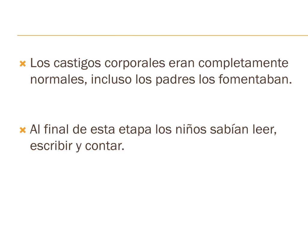 Los castigos corporales eran completamente normales, incluso los padres los fomentaban. • Al final de esta etapa los niños sabían leer, escribir y contar.