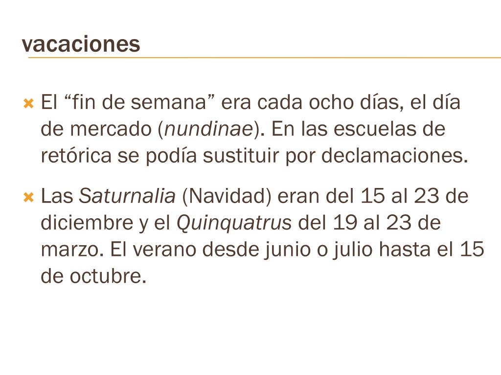 vacaciones • El “fin de semana” era cada ocho días, el día de mercado (nundinae). En las escuelas de retórica se podía sustituir por declamaciones. • Las Saturnalia (Navidad) eran del 15 al 23 de diciembre y el Quinquatrus del 19 al 23 de marzo. El verano desde junio o julio hasta el 15 de octubre.