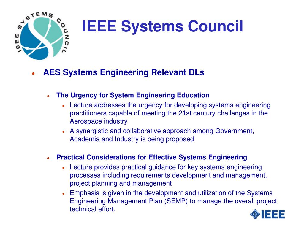 AES Systems Engineering Relevant DLs • The Urgency for System Engineering Education • Lecture addresses the urgency for developing systems engineering practitioners capable of meeting the 21st century challenges in the Aerospace industry • A synergistic and collaborative approach among Government, Academia and Industry is being proposed • Practical Considerations for Effective Systems Engineering • Lecture provides practical guidance for key systems engineering processes including requirements development and management, project planning and management • Emphasis is given in the development and utilization of the Systems Engineering Management Plan (SEMP) to manage the overall project technical effort.