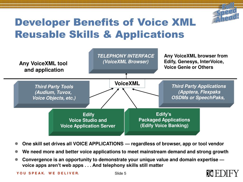 Developer Benefits of Voice XMLReusable Skills & Applications TELEPHONY INTERFACE (VoiceXML Browser) Any VoiceXML browser from Edify, Genesys, InterVoice, Voice Genie or Others Any VoiceXML tool and application VoiceXML Third Party Applications (Apptera, Flexpaks OSDMs or SpeechPaks, Third Party Tools (Audium, Tuvox, Voice Objects, etc.) • One skill set drives all VOICE APPLICATIONS — regardless of browser, app or tool vendor • We need more and better voice applications to meet mainstream demand and strong growth • Convergence is an opportunity to demonstrate your unique value and domain expertise — voice apps aren’t web apps . . . And telephony skills still matter Edify’s Packaged Applications (Edify Voice Banking) Edify Voice Studio and Voice Application Server Y O U S P E A K. W E D E L I V E R.