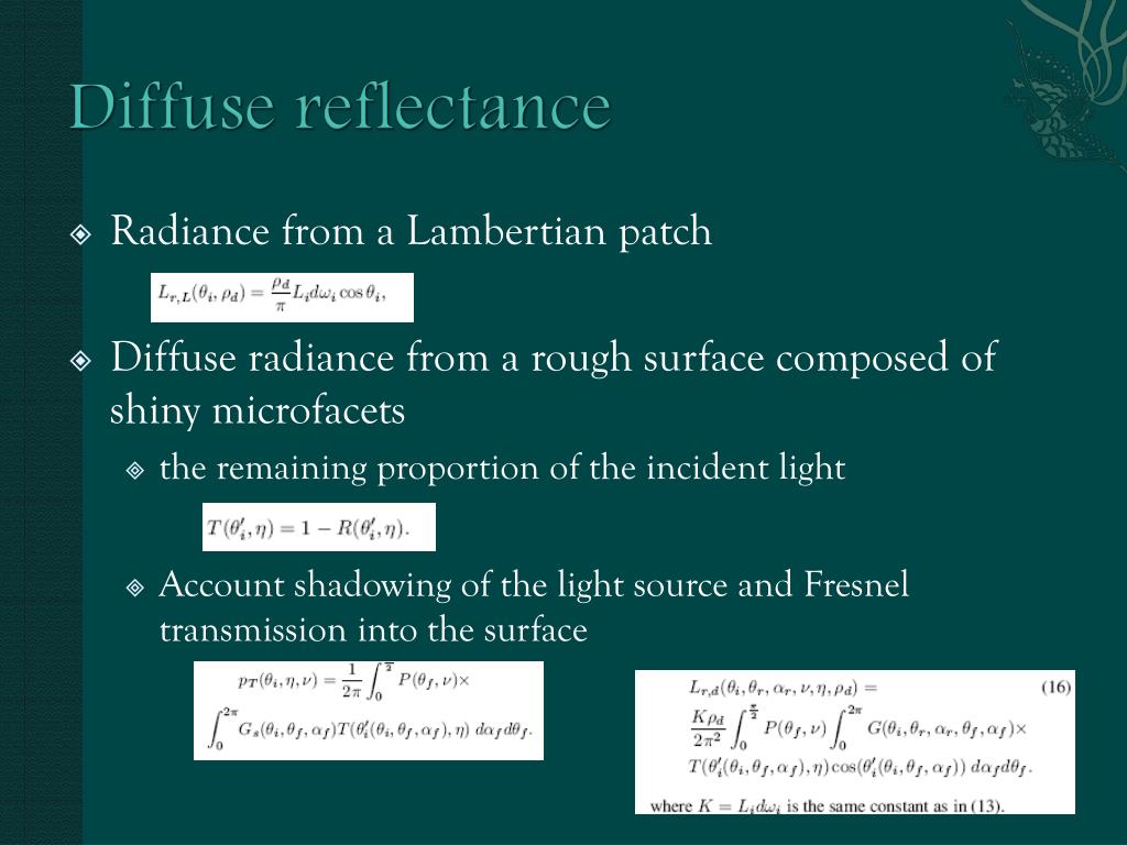 Diffuse reflectance • Radiance from a Lambertian patch • Diffuse radiance from a rough surface composed of shiny microfacets • the remaining proportion of the incident light • Account shadowing of the light source and Fresnel transmission into the surface