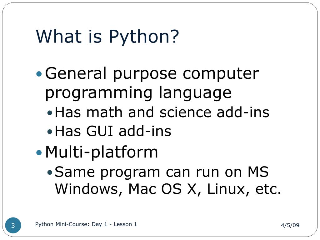 What is Python? • General purpose computer programming language • Has math and science add-ins • Has GUI add-ins • Multi-platform • Same program can run on MS Windows, Mac OS X, Linux, etc. Python Mini-Course: Day 1 - Lesson 1