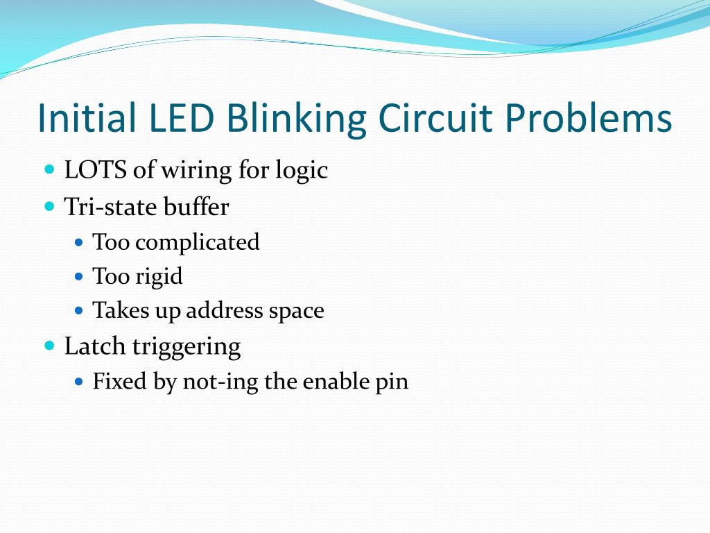 Initial LED Blinking Circuit Problems • LOTS of wiring for logic • Tri-state buffer • Too complicated • Too rigid • Takes up address space • Latch triggering • Fixed by not-ing the enable pin