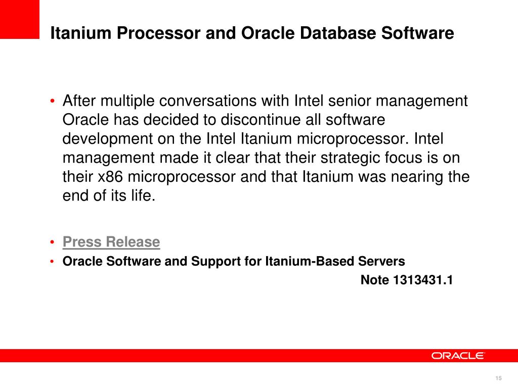 Itanium Processor and Oracle Database Software • After multiple conversations with Intel senior management Oracle has decided to discontinue all software development on the Intel Itanium microprocessor. Intel management made it clear that their strategic focus is on their x86 microprocessor and that Itanium was nearing the end of its life. • Press Release • Oracle Software and Support for Itanium-Based Servers Note 1313431.1