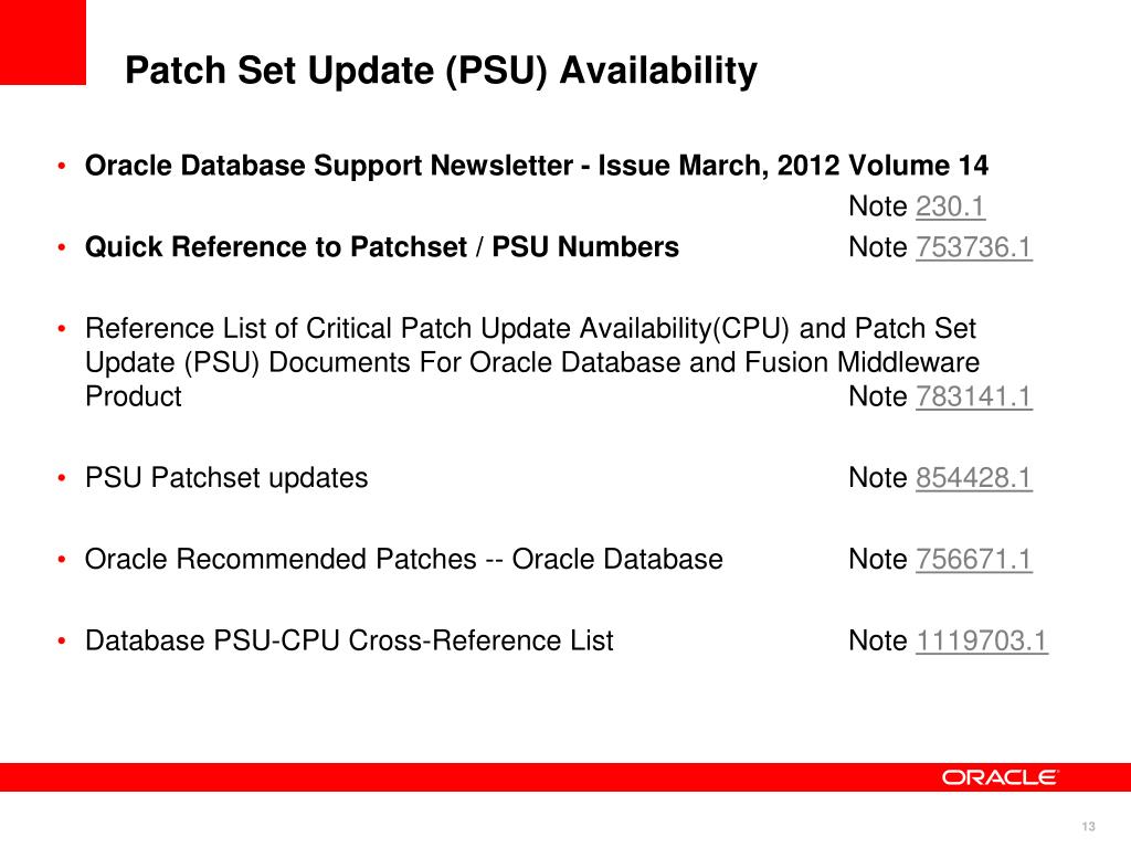 Patch Set Update (PSU) Availability • Oracle Database Support Newsletter - Issue March, 2012 Volume 14 Note230.1 • Quick Reference to Patchset / PSU Numbers Note753736.1 • Reference List of Critical Patch Update Availability(CPU) and Patch Set Update (PSU) Documents For Oracle Database and Fusion Middleware Product Note 783141.1 • PSU Patchset updates Note 854428.1 • Oracle Recommended Patches -- Oracle Database Note 756671.1 • Database PSU-CPU Cross-Reference List Note 1119703.1