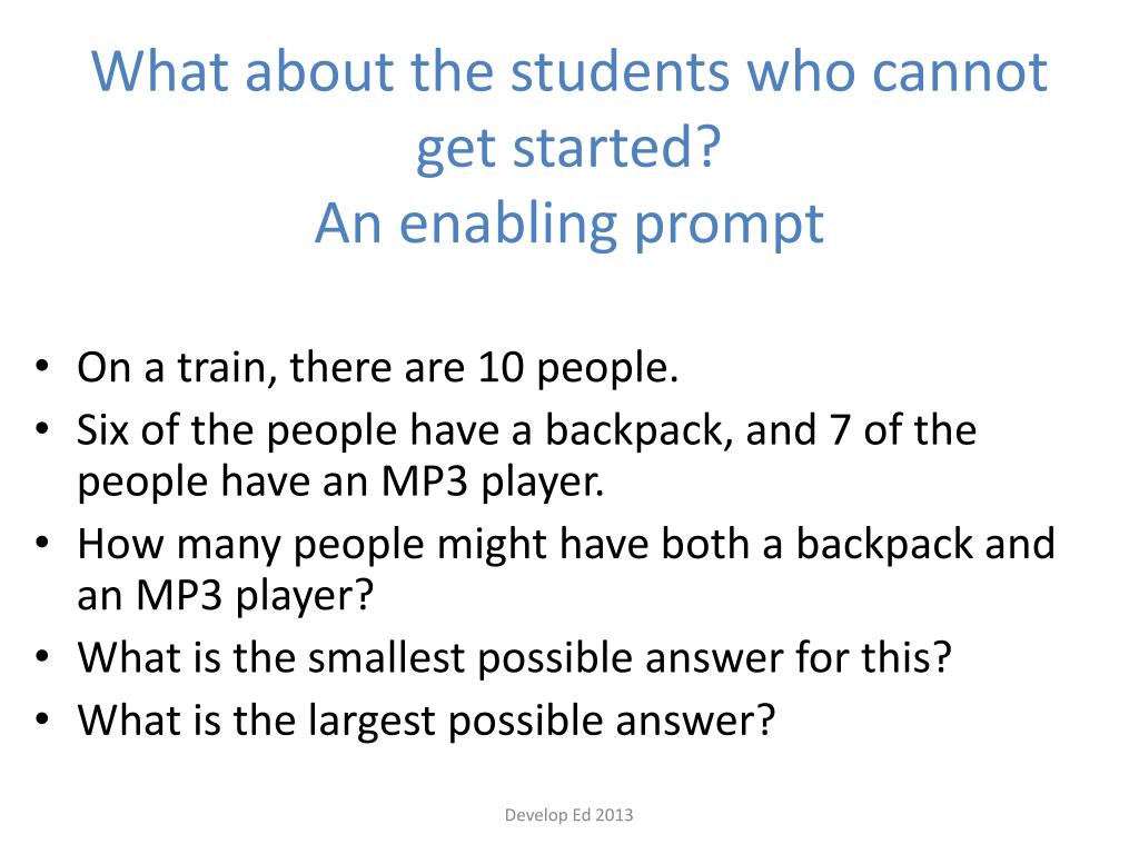 What about the students who cannot get started?An enabling prompt • On a train, there are 10 people. • Six of the people have a backpack, and 7 of the people have an MP3 player. • How many people might have both a backpack and an MP3 player? • What is the smallest possible answer for this? • What is the largest possible answer? Develop Ed 2013