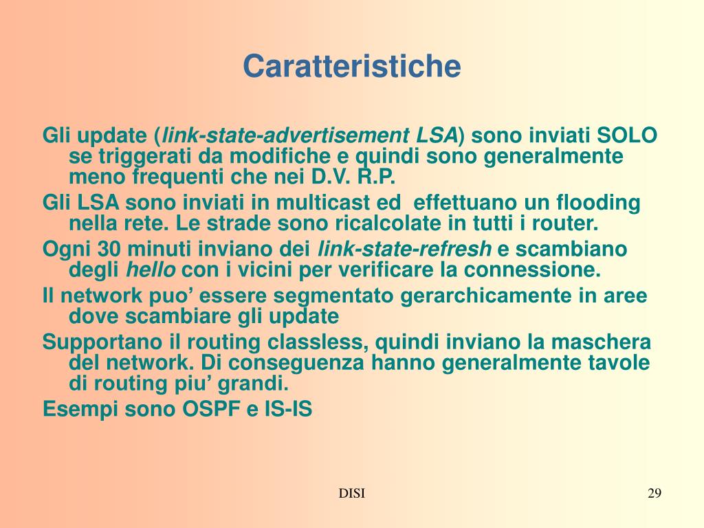 Caratteristiche Gli update (link-state-advertisement LSA) sono inviati SOLO se triggerati da modifiche e quindi sono generalmente meno frequenti che nei D.V. R.P. Gli LSA sono inviati in multicast ed effettuano un flooding nella rete. Le strade sono ricalcolate in tutti i router. Ogni 30 minuti inviano dei link-state-refresh e scambiano degli hello con i vicini per verificare la connessione. Il network puo’ essere segmentato gerarchicamente in aree dove scambiare gli update Supportano il routing classless, quindi inviano la maschera del network. Di conseguenza hanno generalmente tavole di routing piu’ grandi. Esempi sono OSPF e IS-IS DISI