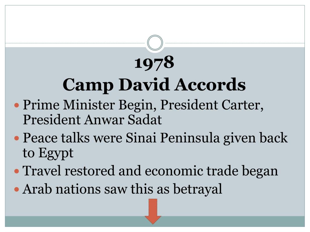 1978 Camp David Accords • Prime Minister Begin, President Carter, President Anwar Sadat • Peace talks were Sinai Peninsula given back to Egypt • Travel restored and economic trade began • Arab nations saw this as betrayal