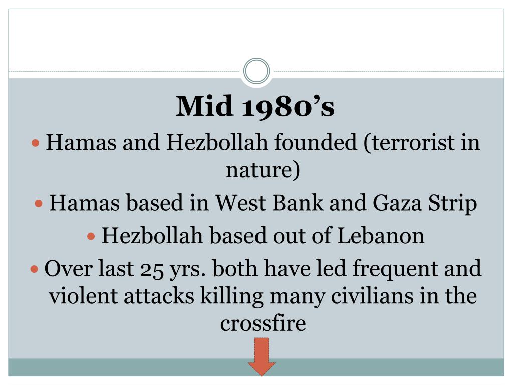 Mid 1980’s • Hamas and Hezbollah founded (terrorist in nature) • Hamas based in West Bank and Gaza Strip • Hezbollah based out of Lebanon • Over last 25 yrs. both have led frequent and violent attacks killing many civilians in the crossfire