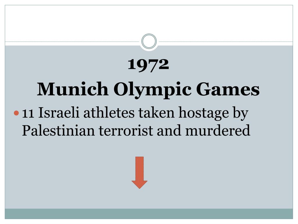 1972 Munich Olympic Games • 11 Israeli athletes taken hostage by Palestinian terrorist and murdered