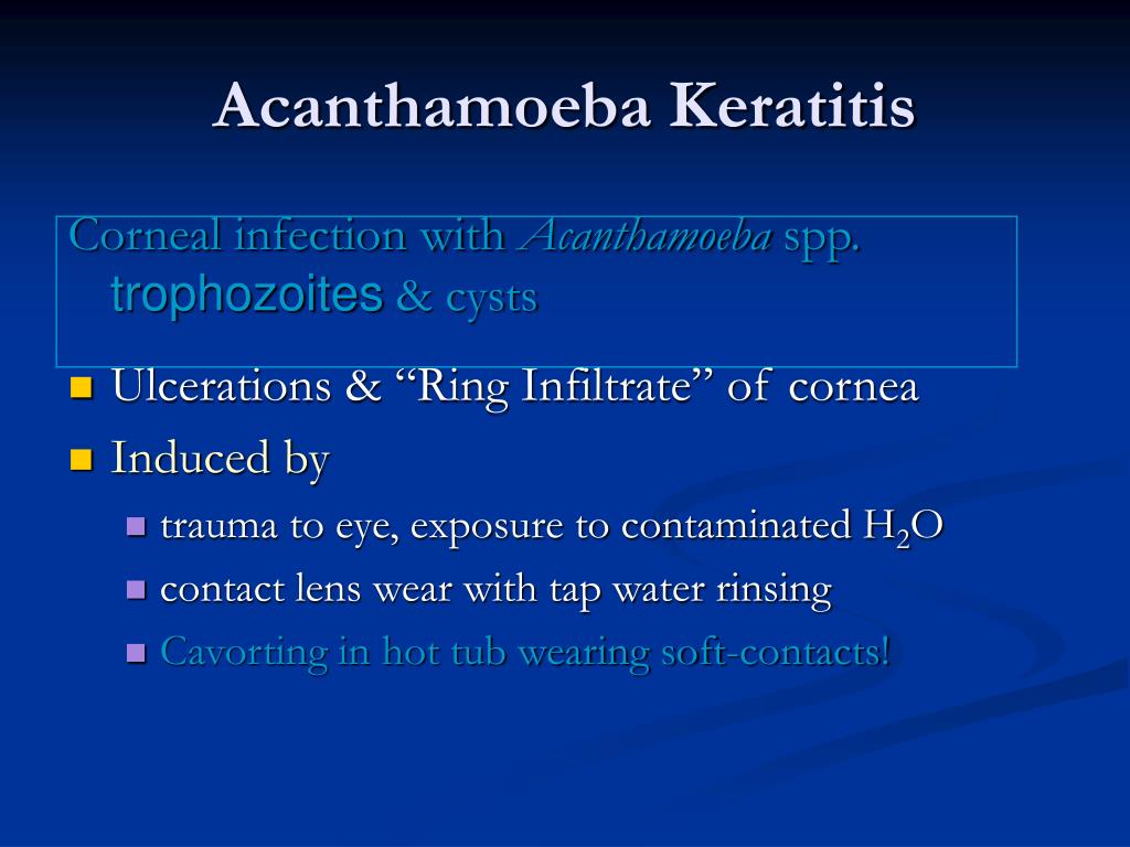 Acanthamoeba Keratitis Corneal infection with Acanthamoeba spp. trophozoites & cysts • Ulcerations & “Ring Infiltrate” of cornea • Induced by • trauma to eye, exposure to contaminated H2O • contact lens wear with tap water rinsing • Cavorting in hot tub wearing soft-contacts!
