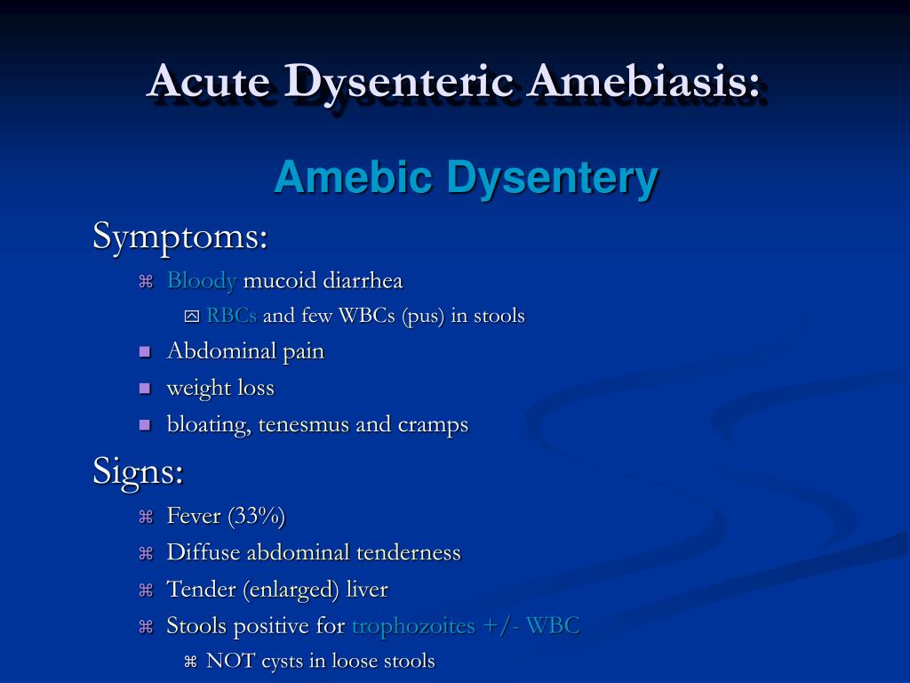 Acute Dysenteric Amebiasis: Amebic Dysentery Symptoms: • Bloody mucoid diarrhea • RBCs and few WBCs (pus) in stools • Abdominal pain • weight loss • bloating, tenesmus and cramps Signs: • Fever (33%) • Diffuse abdominaltenderness • Tender (enlarged) liver • Stools positive for trophozoites +/- WBC • NOT cysts in loose stools